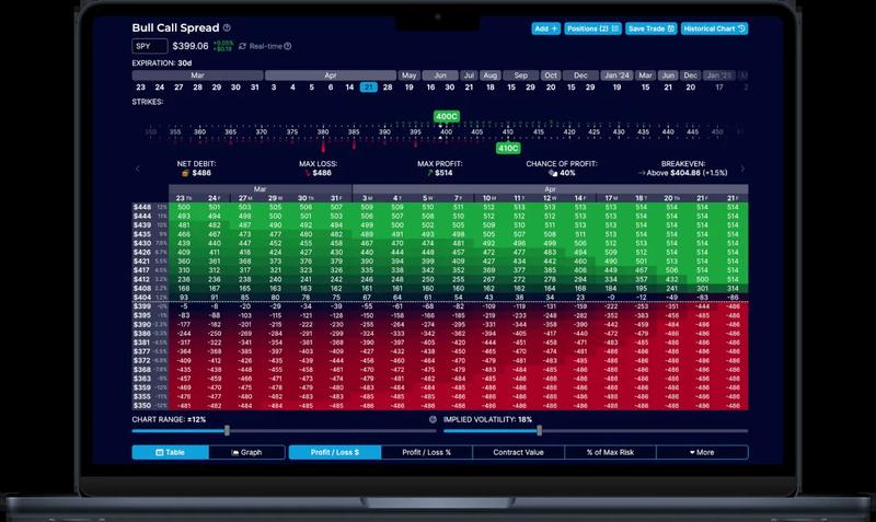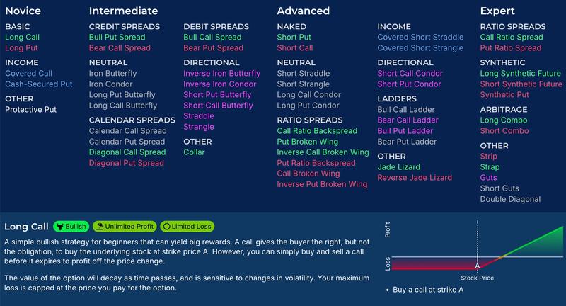 The visual strategy builder is OptionStrat's defining feature and the best options visualization tool available to retail traders. Over fifty pre-built strategies render as interactive, color-coded profit/loss tables that update in real time as you drag strike prices and adjust expiration dates. The interface makes complex multi-leg strategies — iron condors, butterflies, ratio spreads — immediately legible. Multiple reviewers have called it the most intuitive options tool they have tested, and the App Store's 4.8 out of 5 rating across nearly two thousand reviews supports that assessment.